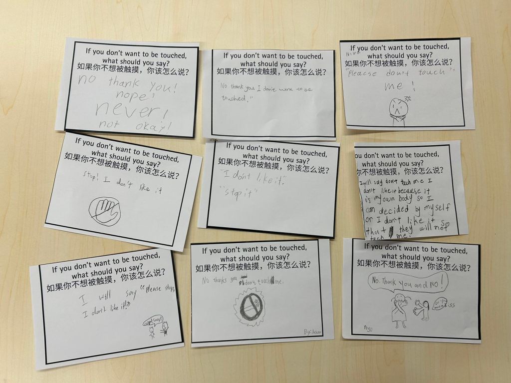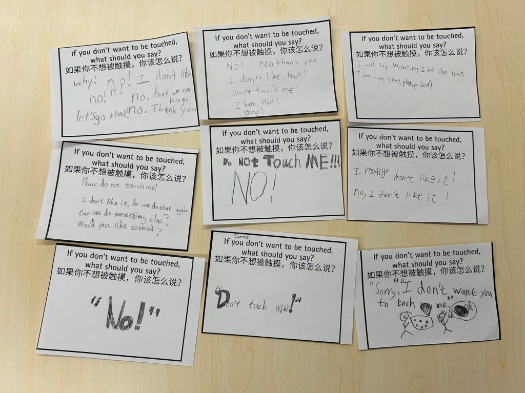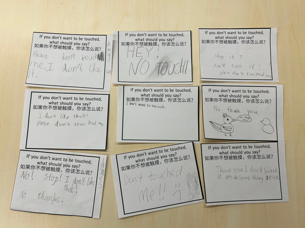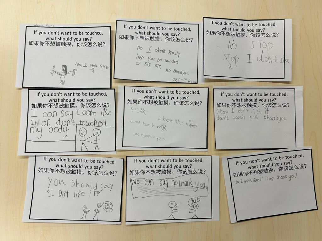 Younger primary students learned an important lesson about consent and bodily autonomy this week while reading Rissy No Kissies by Katey Howes. Before we read the story, we discussed what consent means and how to say yes and no when protecting your body. Rissy knows how to protect her space and her body, and it’s important that students know how also. Scroll through the images below to see how students answered the question: “If you don’t want to be touched, what should you say?”