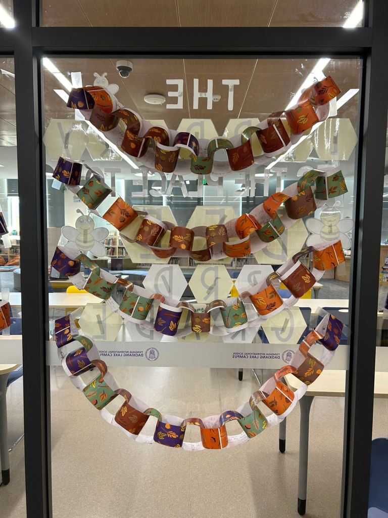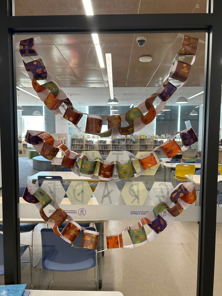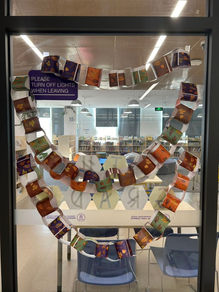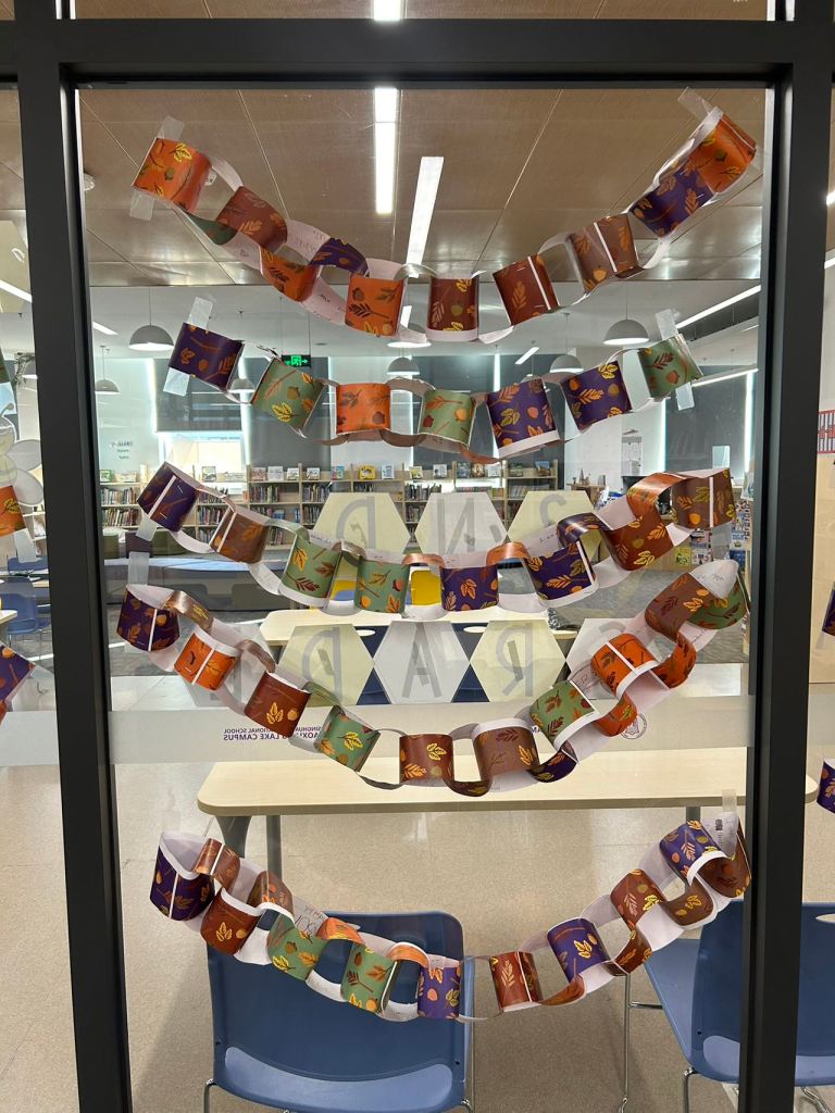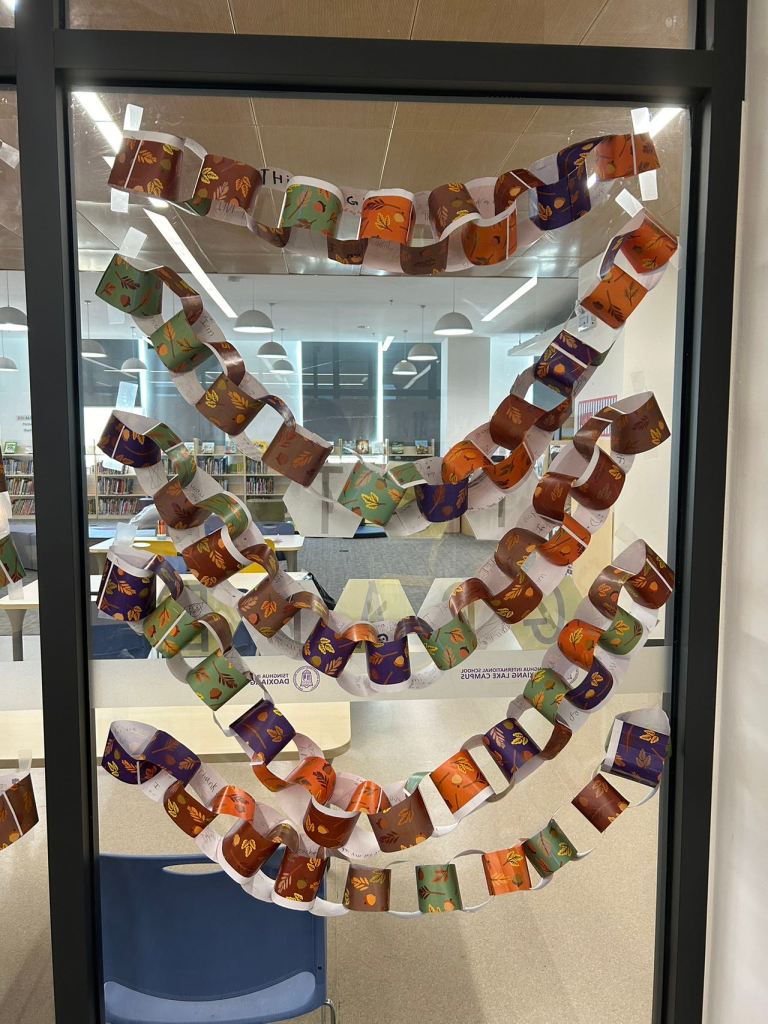 The girl in the story makes a paper chain throughout the year. When she remembers something she is thankful for, she writes it on a piece of paper and attaches it to the chain until it is very long and drapes around her windows. Each student contributed their own thankful paper to make their own paper chain for their class, which was displayed on the windows in the library.