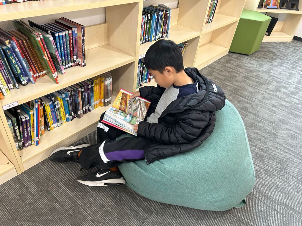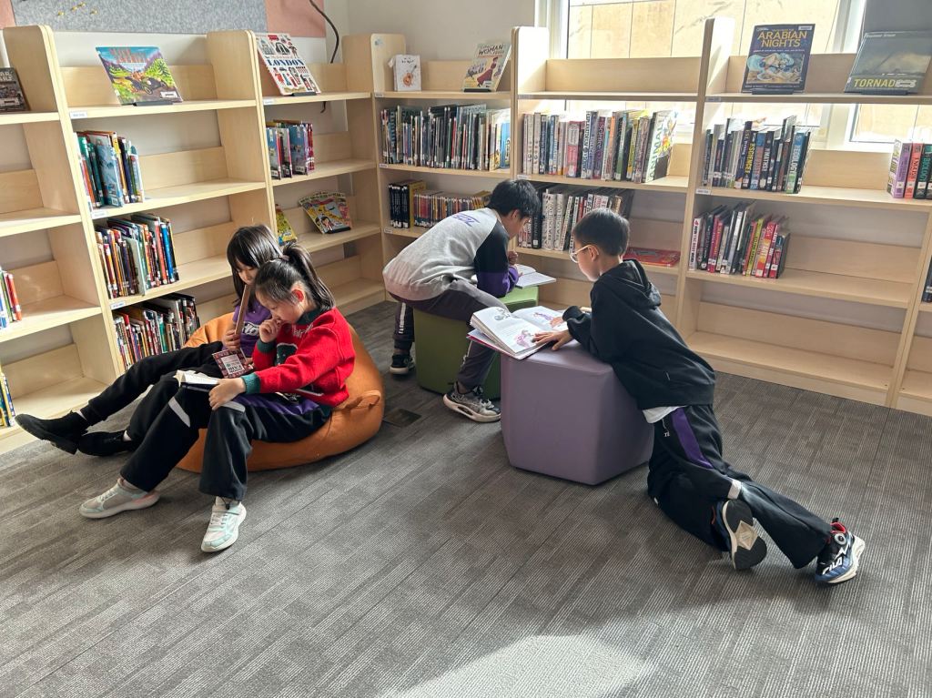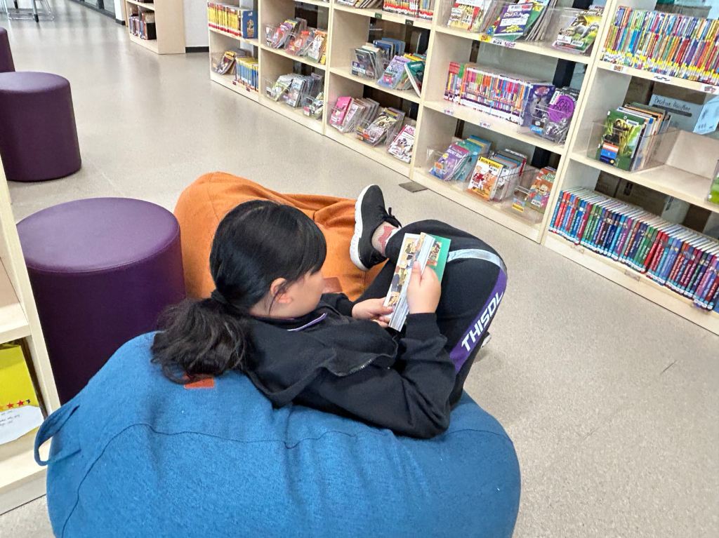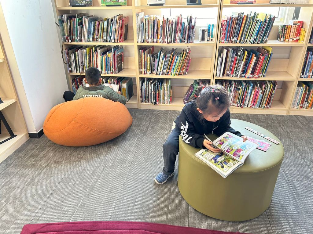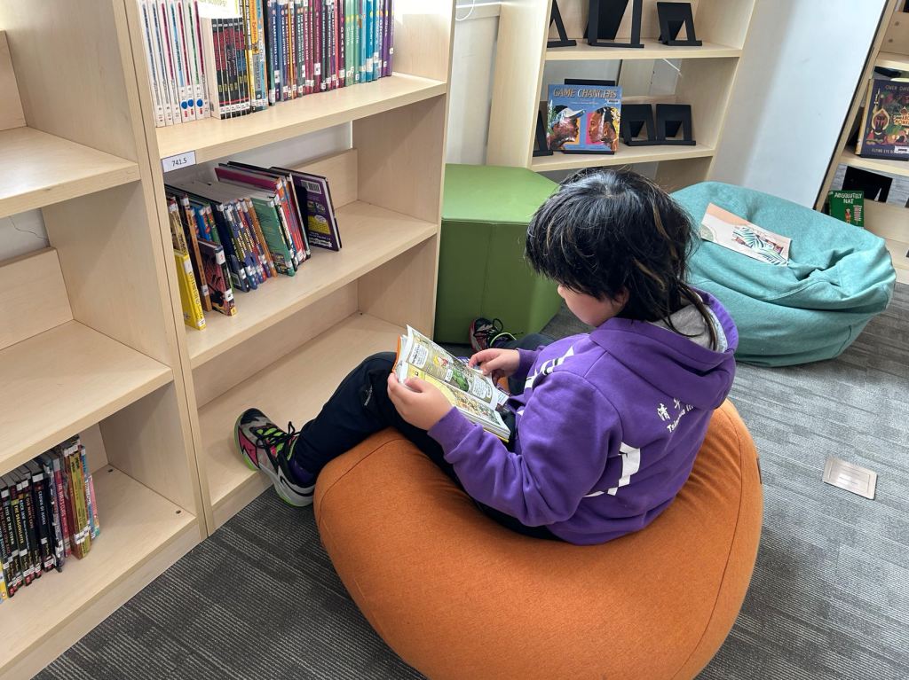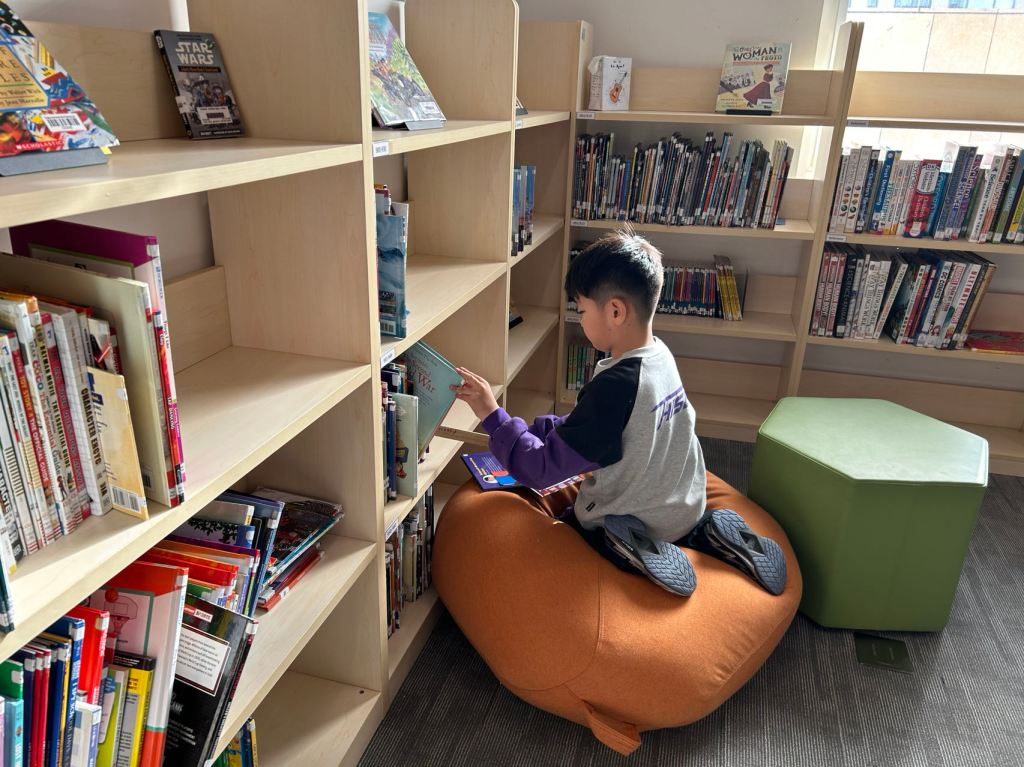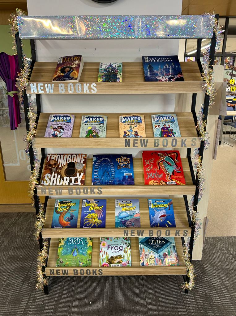 We have some new decorations for our shelves! Now our new books will be proudly displayed on our sparkly New Book Shelf so students can always see what books have recently arrived at the library. We have also introduced the Nevermind Cart, which students can use if they decide to put a book back but don’t know where it goes on the shelf.