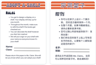 You can download a copy of the Adopt-a-Shelf form below. Please turn in this form and Ms. Claire will let you know when your shelf is ready for you to decorate!