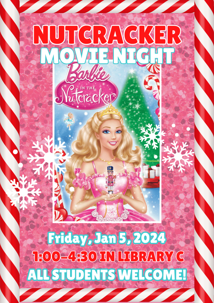 由于本周的在线日子,我们不得不推迟《胡桃夹子》电影日和书展。 幸运的是,两者都被重新安排在休息后的一周! 书展将于 1 月 3 日星期三至 1 月 5 日星期五开放,电影将于 1 月 5 日星期五下午 1:00-4:30 在主图书馆放映。 下面的海报有更新的信息。