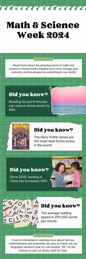 Happy Math and Science Week! The library is the perfect place to learn more about math and science. Check out some of the books below to pique your curiosity!