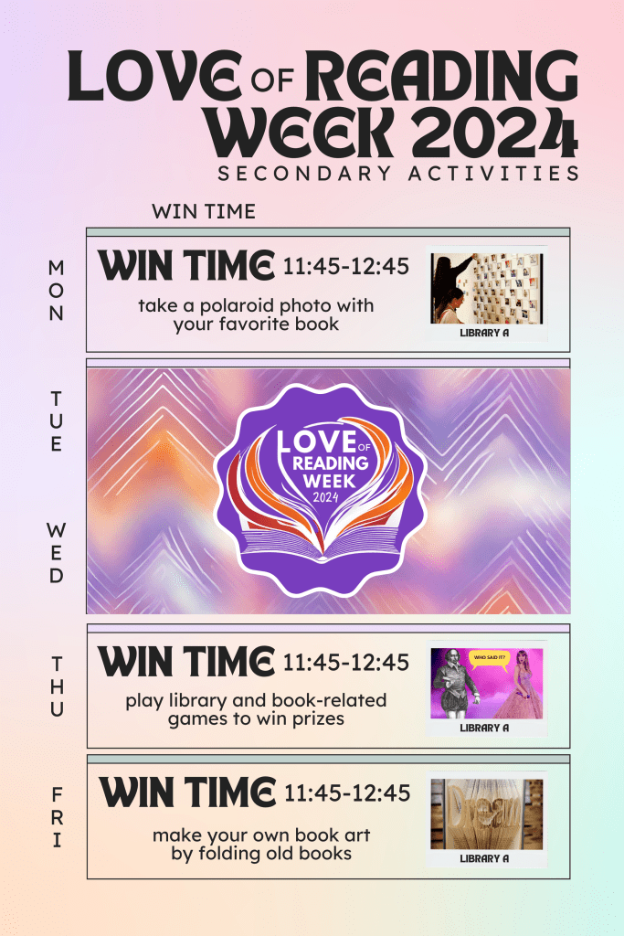Happy Love of Reading Week! This week we’re planning some extra fun activities to get students more involved in reading and using the library. Take a look below at our schedule of events.