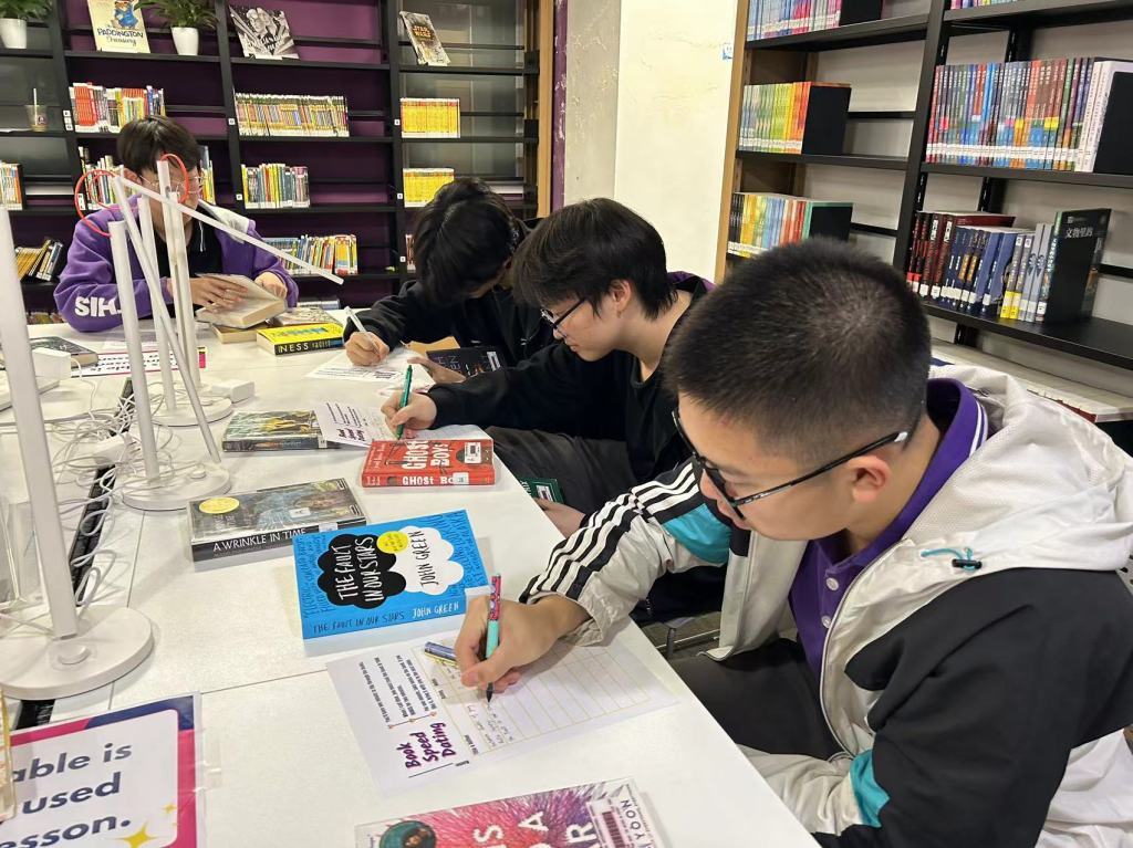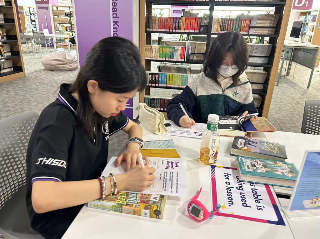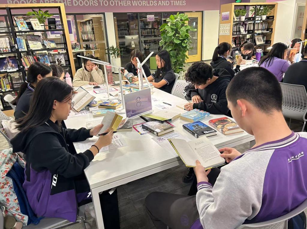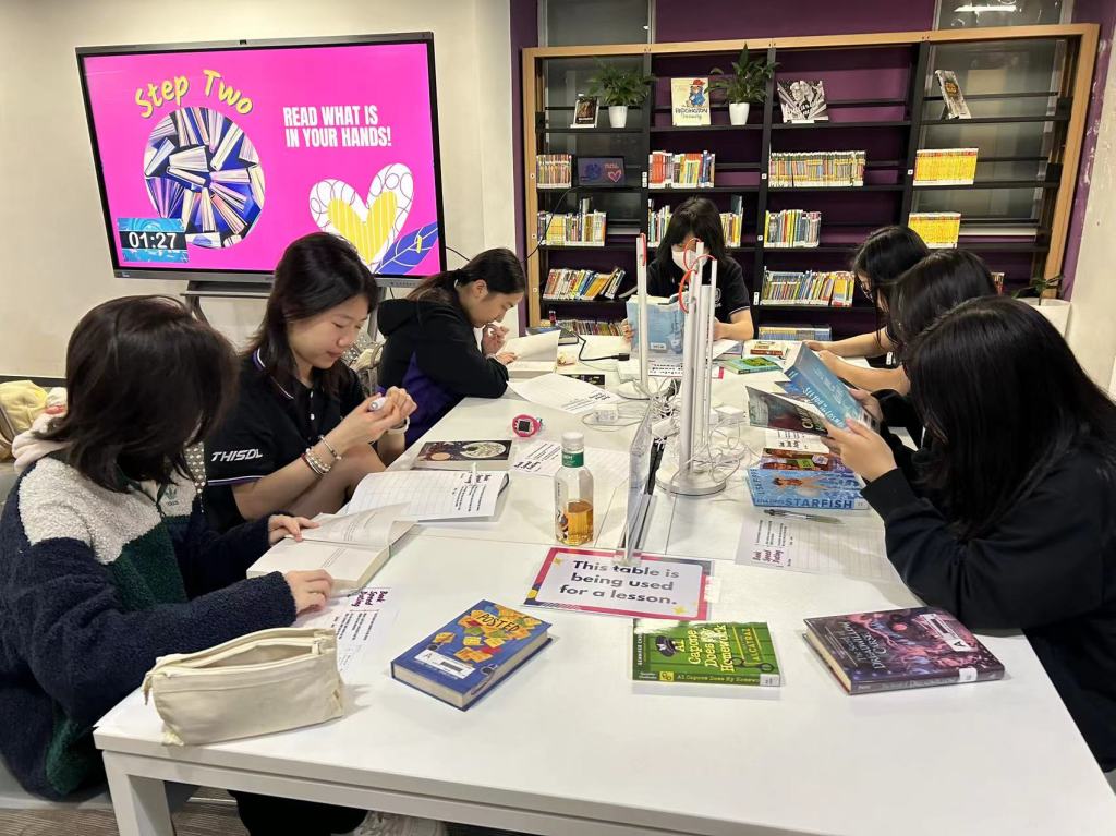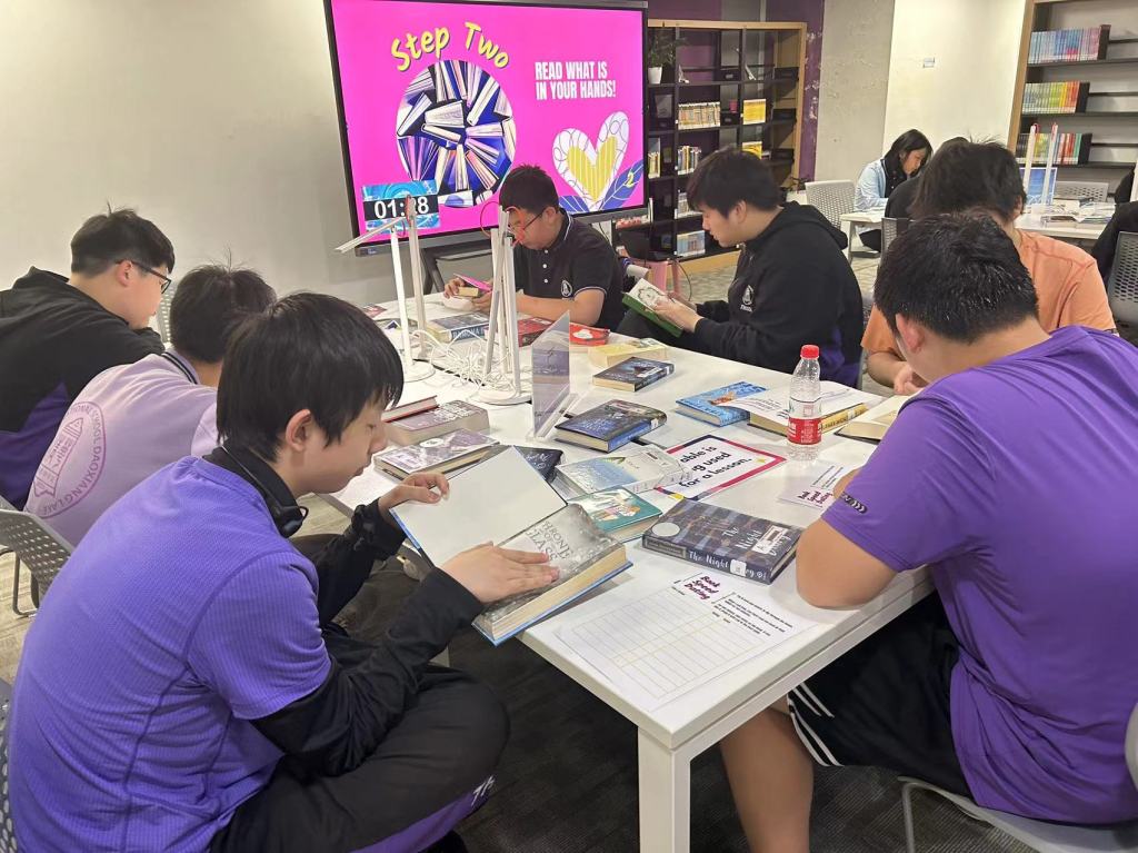为了促进高年级学生对阅读的热爱,董老师安排了初中和高中英语课程的图书馆课程。这是一次特别的 “图书速配 “活动,在一堂课的时间内向学生介绍了几十本书。学生们被要求花一些时间看完所有的书,两分钟读完一本书,然后做笔记并给自己读过的书打分。课堂结束时,希望每个人都能找到一本适合在爱读书周阅读的好书!其他班级可以休息一下,在户外野餐毯上阅读。