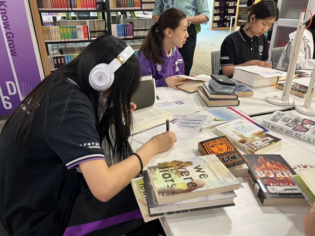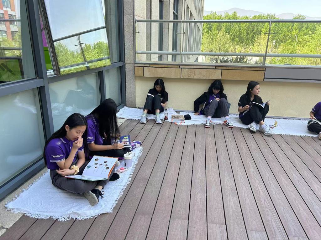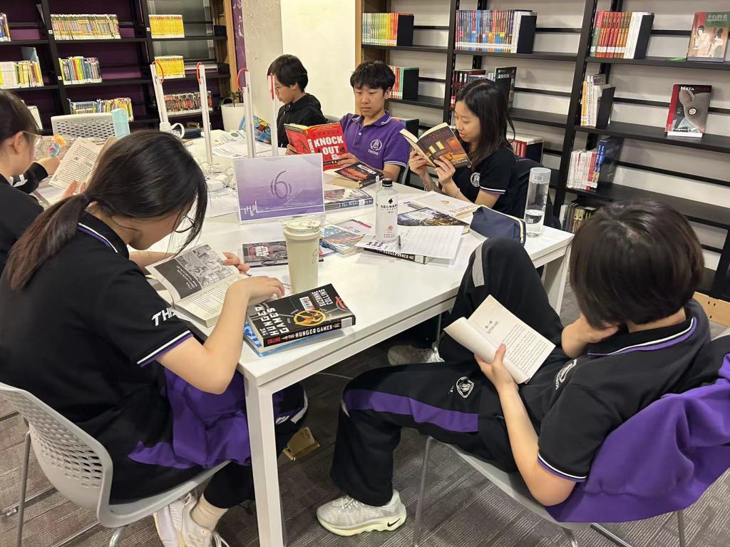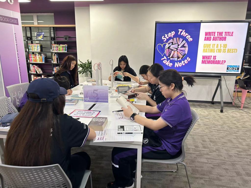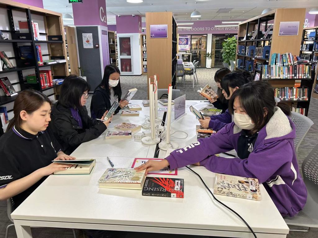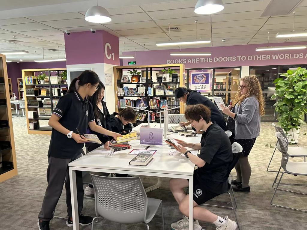 为了促进高年级学生对阅读的热爱,董老师安排了初中和高中英语课程的图书馆课程。这是一次特别的 “图书速配 “活动,在一堂课的时间内向学生介绍了几十本书。学生们被要求花一些时间看完所有的书,两分钟读完一本书,然后做笔记并给自己读过的书打分。课堂结束时,希望每个人都能找到一本适合在爱读书周阅读的好书!其他班级可以休息一下,在户外野餐毯上阅读。