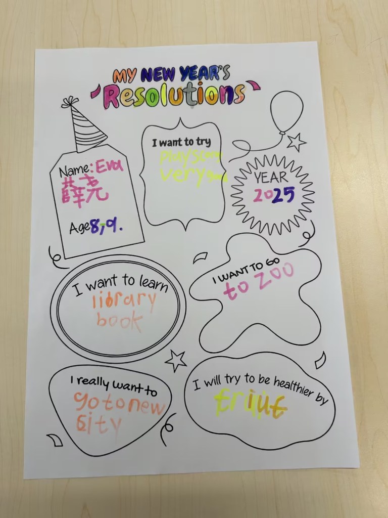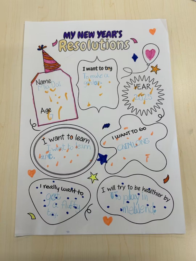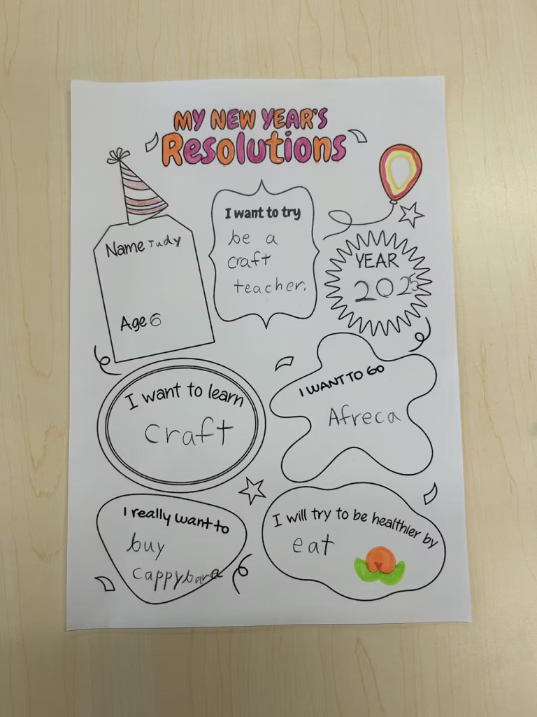 I Wish You More by Amy Krouse Rosenthal is a heartwarming picture book that celebrates life’s simple joys and expresses heartfelt wishes for happiness, resilience, and love. With gentle words and charming illustrations, it inspires readers of all ages to cherish hope, kindness, and the beauty of life’s little moments. After reading, students were invited to fill out a “My New Year’s Resolutions” sheet to express their own wishes for the new year.
