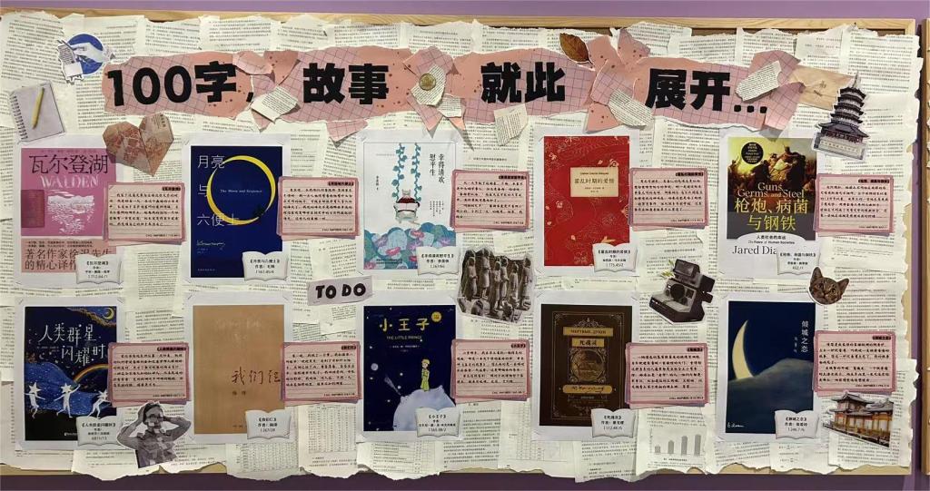 董老师和蔡老师还在图书馆教室旁边的走廊上设置了一个新的 《100字,故事就此展开》展板。快来看看吧,看看你是否会被这些书的前100字打动,从而借阅其中一本!