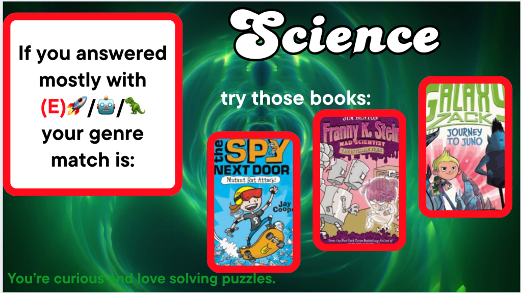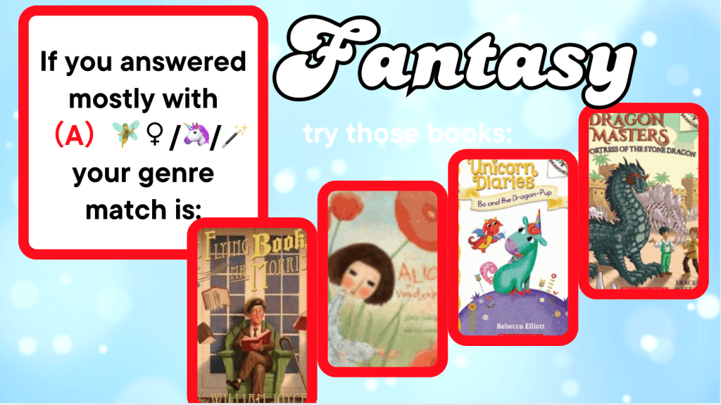 Our second graders explored the exciting world of fiction genres this week! Each student took a fun quiz to discover which genre might be a great match for them. Afterward, Ms. Ray recommended books based on their results, helping everyone find a story they’ll love to dive into.