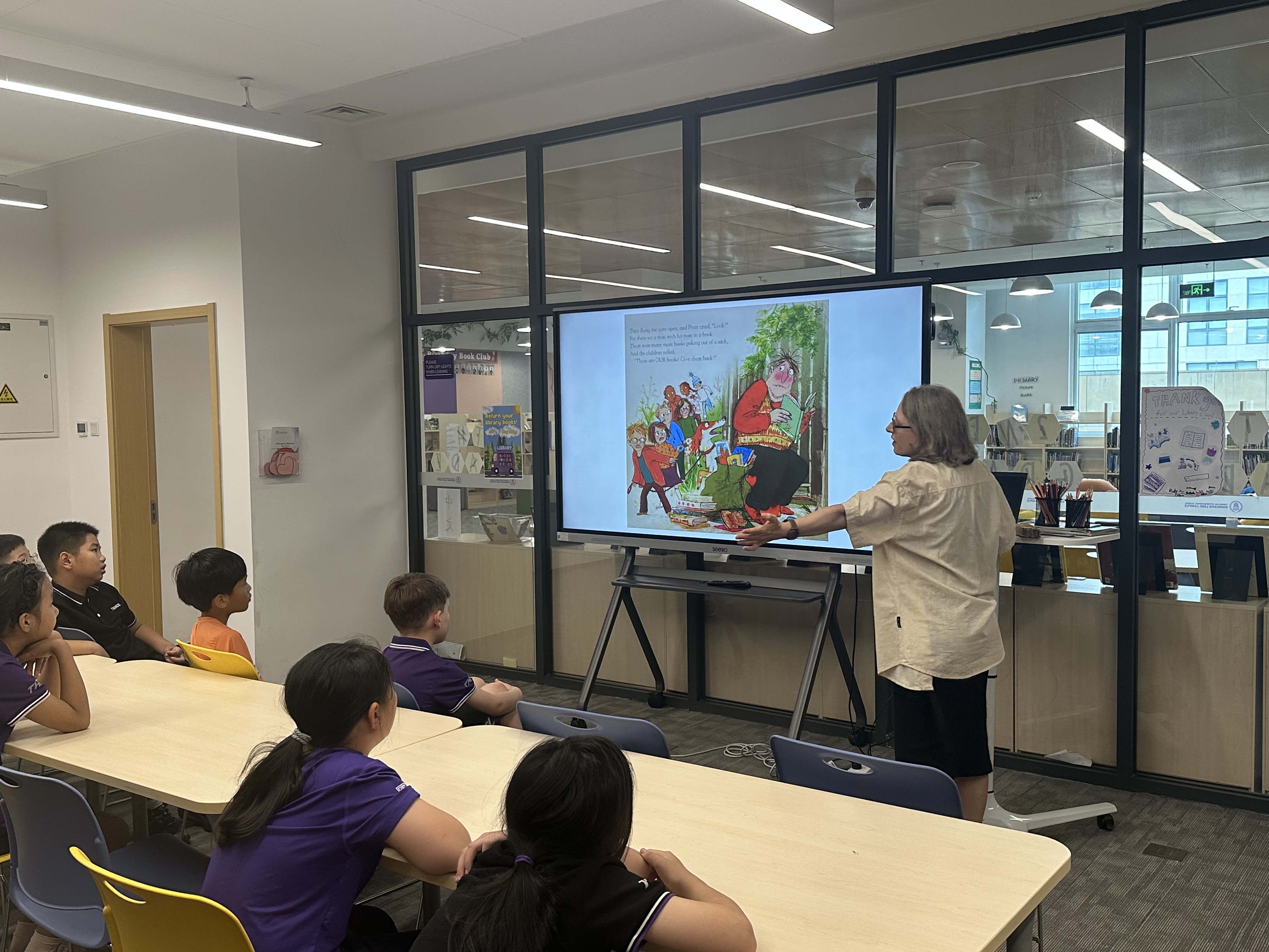 虽然从封面可能看不出来,但朱莉娅·唐纳森的《侦探狗》其实是个关于图书馆的故事!侦探狗奈尔展开调查,试图解开图书馆书籍失踪之谜。我们的新任图书馆老师李老师也向高年级同学们做了自我介绍,并重温了图书馆使用规范。