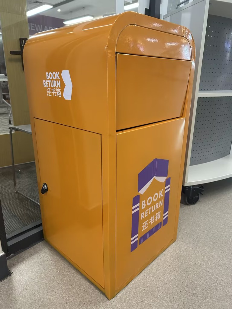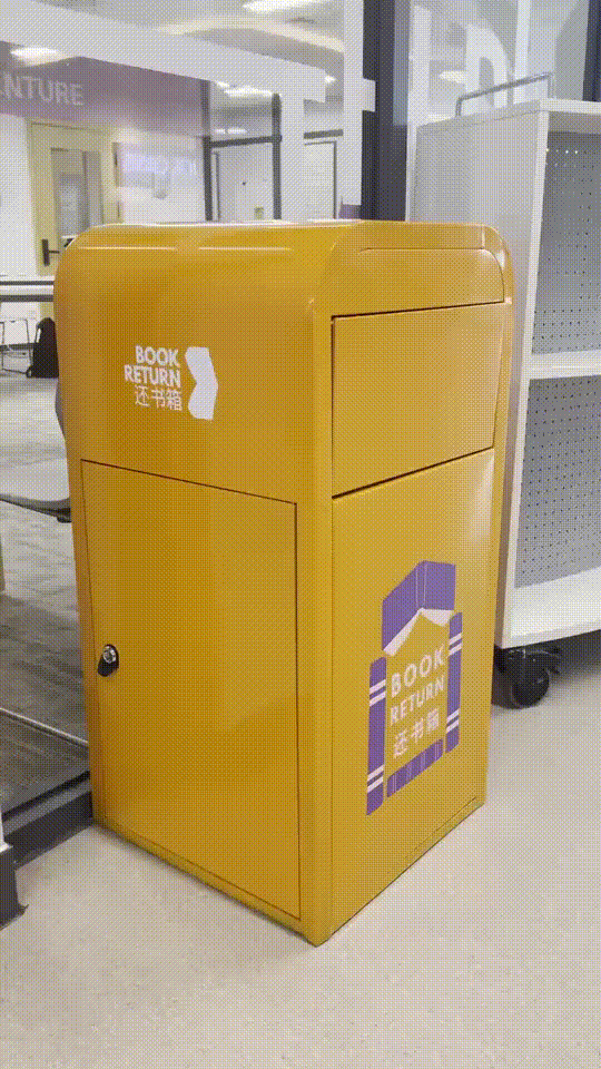 图书馆A区迎来了一位新助手!快来认识我们的新型还书箱!即使找不到图书馆工作人员帮忙,这位得力助手也能妥善收纳待归还的书籍。请放心,这位新助手会安全保管您的图书,直到我们完成登记并重新上架。