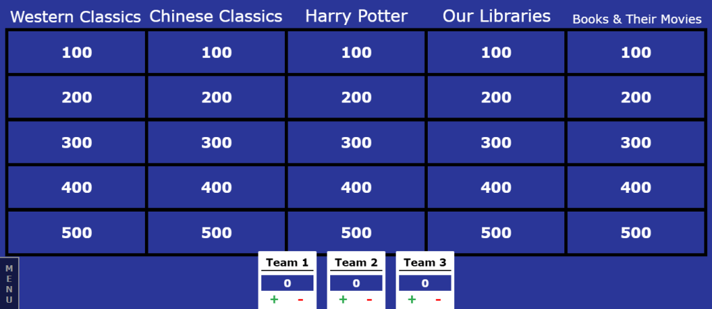 For the truly ambitious, try playing “Jeopardy Trivia: Literary Legends Edition!” In this game show style trivia game, students had to answer questions from five different categories, each with five levels of difficulty: Western Classics, Chinese Classics, Harry Potter, Our Libraries, and Books & Their Movies. Think your team can win? Play with your friends by clicking the image below!