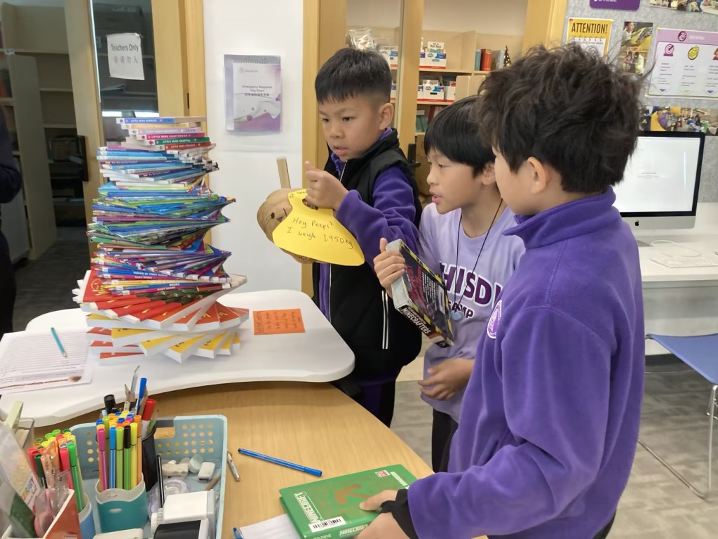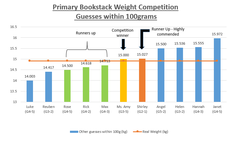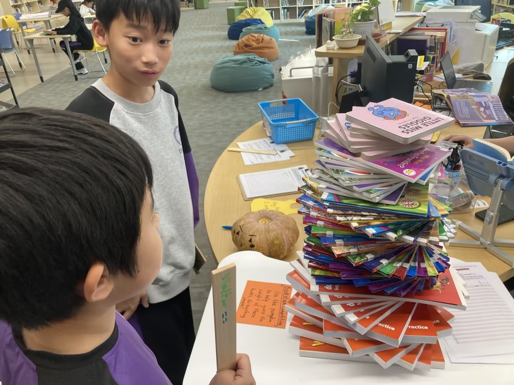 Come one, come all! Guess the book stack, standing tall! Use your eyes to estimate, write down numbers for the weight! Students combined their experience of reading and their skills at estimation to participate in the new Book Stack Weight Competition. Need a hint? Take a peek at the sample pumpking weight. Happy guessing, and happy reading!