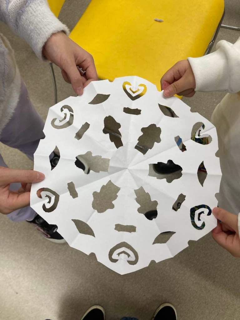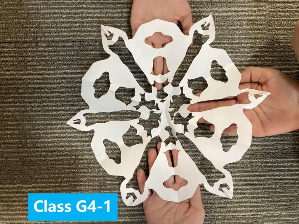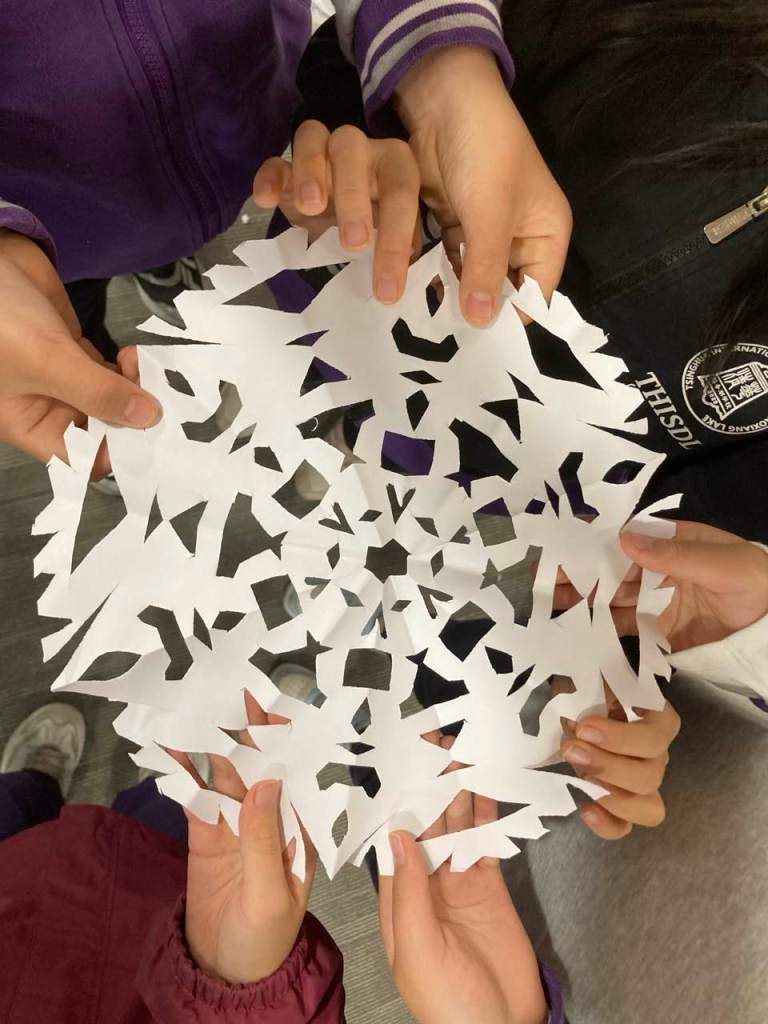 露·特里利文与麦迪·弗罗斯特合作的绘本《雪花的失误》讲述了冰雪女王与女儿的故事:当造雪机故障后,公主不得不亲手裁剪每片雪花,从而创造出千姿百态的冰晶图案。随后各班同学制作了集体折叠纸雪花,作品已发布在专题页面,您也可通过此链接获取制作指南:https://www.instructables.com/How-to-Make-6-Pointed-Paper-Snowflakes/
