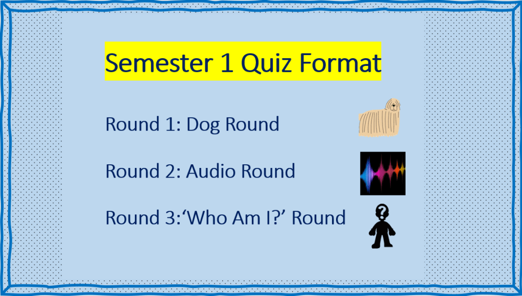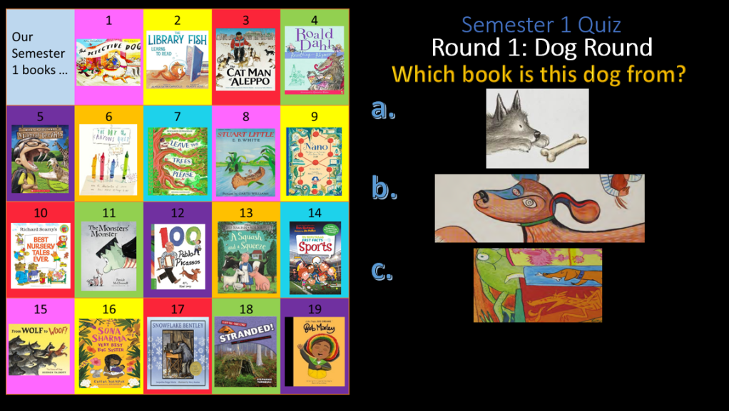 We’ve read a lot of books this semester! What can you remember? This week our G3-4 students did a review quiz of all the books from first semester. Students saw pictures of dogs and had to use their memory to write down which book the dog was from. Then they listened to an audio track of an excerpt/sound from the book and determine which character said it! Finally we collected the students’ rating of the books and their favorite genres. We can’t wait for all our new books this coming semester!