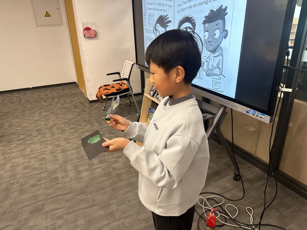 Now in chapters 4-6 of The Alien Next Door: The New Kid, Harris is even more sure that new boy Zeke is an alien. Zeke can do things normal kids can’t–like do a handstand on one finger! During art class, Zeke is also incredibly skilled at mixing paints and making rainbows out of different combinations. Is this proof of his alienness? Or just artistic prodigy? Our students tried the same paint experiment as the characters in the book to see for themselves!