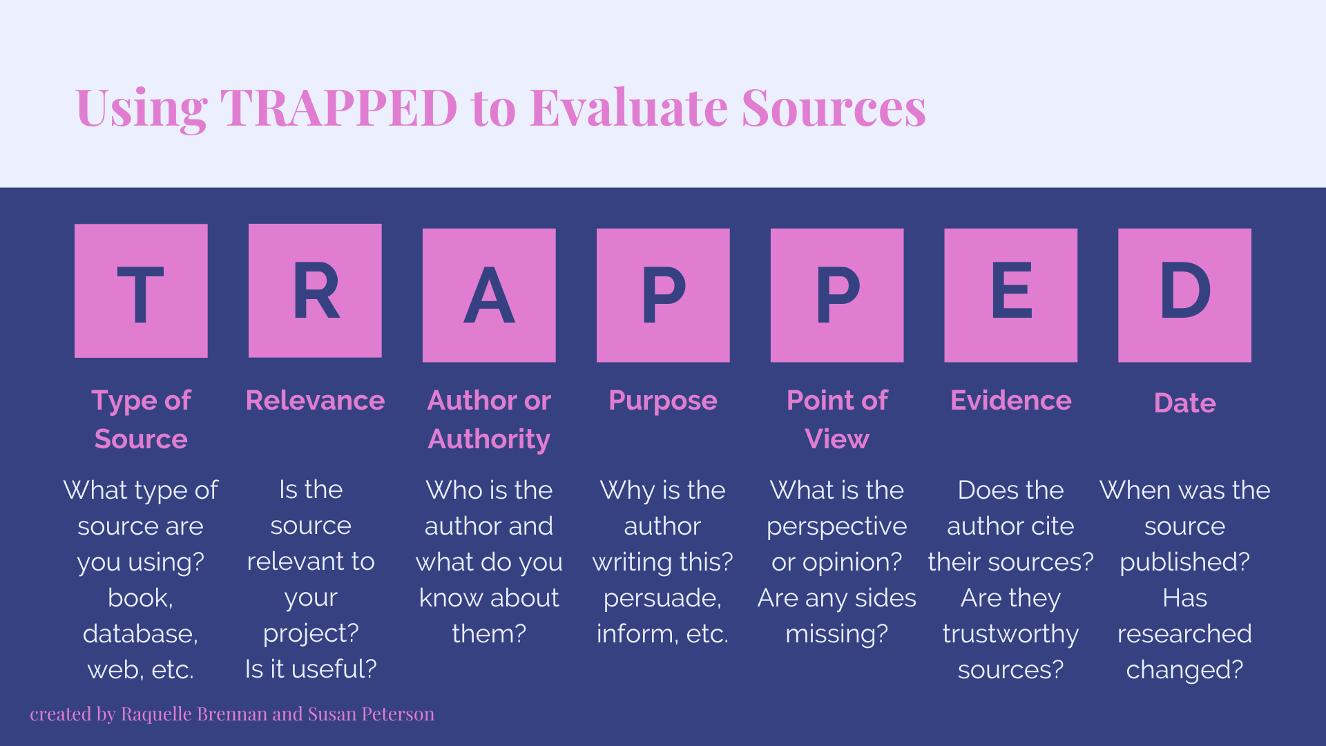 Our librarians would love to teach your class about source evaluation! Feel free to schedule a library lesson or use our amazing resources! Scroll to the bottom of the page to listen to Ms. Dong’s lesson on source evaluation using TRAPPED.